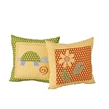 - Two accent pillows are appliquéd with a little turtle and yellow daisy