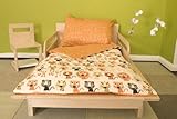 My son received this as a gift for his second birthday. After the initial wash and putting it as the bedding on his toddler bed, he was extremely happy to go into his bed and seeing this beautiful pattern! He seen it and ran over to his bed and jumped on top and hugged his blanket and the matching pillow (=purchased separately=). He snuggled underneath the comforter and said "good night". The material is extremely soft.....organic cotton....doesn't feel like a fake material, and is breathable. After a few washes, the color has not faded...I love how it came with two sheets. One that matches the top of the comforter....and the other sheet, matches the orange and yellow. It fits perfectly on a toddler bed and is made in America....right out of L.A. California. I love this bedding set, and can't wait to buy the Twin Size when he gets older. you can get them cheapest on Amazon through this link.